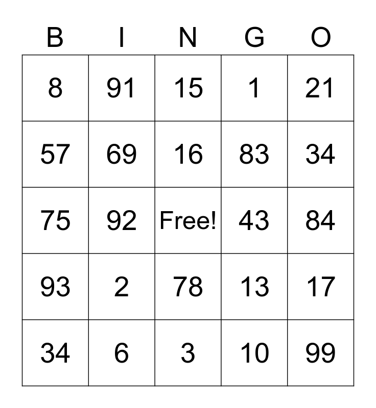 This bingo card has a free space and 24 words: 2, 6, 16, 34, 21, 8, 57, 91, 43, 78, 83, 75, 13, 17, 69, 10, 84, 15, 34, 92, 99, 93, 1 and 3.