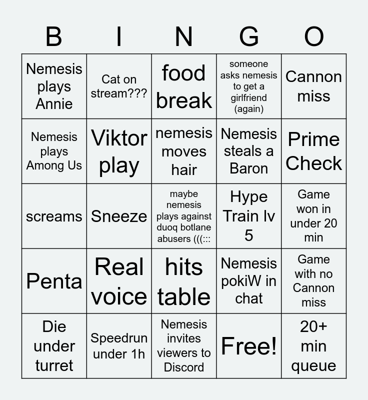 This bingo card has 32 words: Free!, JJDR Timeout, Sneeze, Naughty smokes in chat, Penta, Viktor play, Cannon miss, Game with no Cannon miss, Cat on stream???, 20+ min queue, nemesis moves hair, food break, Sub, Play top, Hype Train lv 5, One Plus promo, Die under turret, screams, hits table, Real voice, Nemesis pokiW in chat, mentions minecraft speedrun, Game won in under 20 min, Speedrun under 1h, maybe nemesis plays against duoq botlane abusers (((:::, someone asks nemesis to get a girlfriend (again), Nemesis steals a Baron, Nemesis plays Among Us, Nemesis plays Annie, Nemesis invites viewers to Discord, Best Friend Check and Prime Check.