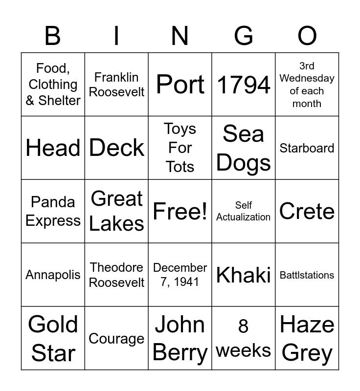 This bingo card has a free space and 35 words: USS Arizona, USS Constitution, Marmac & Monitor, Deck, December 7, 1941, 1794, Head, Motivation, Toys For Tots, 100 Gifts, Panda Express, 3rd Wednesday of each month, Participation Ribbon, 12 hours, Food, Clothing & Shelter, Self Actualization, 8 weeks, Great Lakes, Annapolis, Haze Grey, Khaki, Gold Star, Battlstations, Courage, Port, Starboard, Empathy, Apathy, Sea Dogs, Crete, 6 Frigates, John Berry, Theodore Roosevelt, Franklin Roosevelt and Great White Fleet.