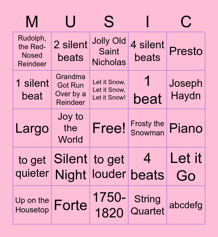 This bingo card has a free space and 29 words: Up on the Housetop, Jingle Bells, Joy to the World, Silver Bells, Rudolph, the Red-Nosed Reindeer, Jolly Old Saint Nicholas, Grandma Got Run Over by a Reindeer, Silent Night, Frosty the Snowman, Forte, Piano, abcdefg, 1750-1820, String Quartet, Joseph Haydn, Ludwig van Beethoven, to get louder, to get quieter, Presto, Largo, 4 beats, 2 beats, 1 beat, 1 silent beat, 4 silent beats, 2 silent beats, Let it Go, Let it Snow, Let it Snow, Let it Snow! and Walking in a Winter Wonderland.