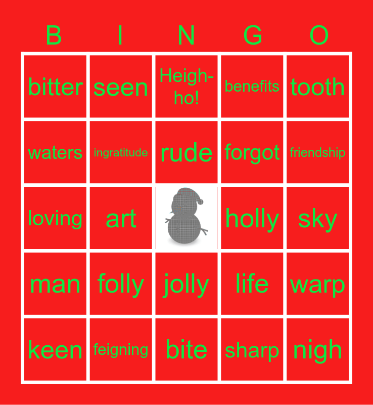This bingo card has a free space and 33 words: winter, wind, art, unkind, man, ingratitude, tooth, keen, seen, breath, rude, Heigh-ho!, sing, green, holly, friendship, feigning, loving, folly, life, jolly, Freeze, bitter, sky, bite, nigh, benefits, forgot, waters, warp, sting, sharp and remembered.