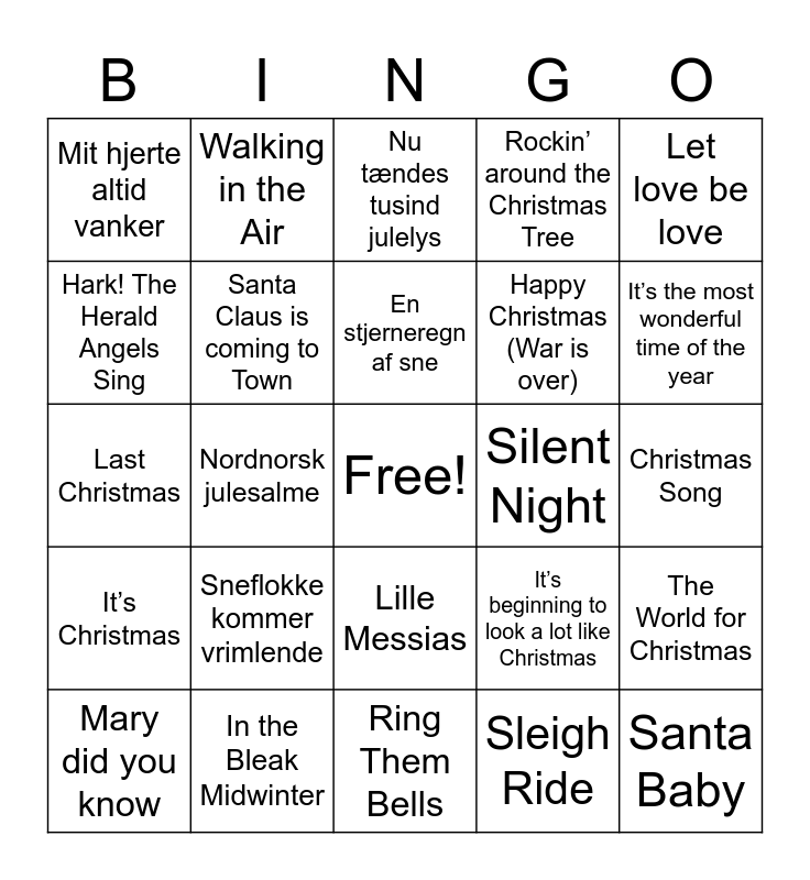 This bingo card has a free space and 40 words: God rest ye merry Gentleman, Last Christmas, Have yourself a merry little Christmas, Santa Claus is coming to Town, In the Bleak Midwinter, Lille Messias, En stjerneregn af sne, Til julebal i Nisseland, Let love be love, It’s Christmas, Nordnorsk julesalme, Rockin’ around the Christmas Tree, Santa Baby, Christmas Song, Silent Night, Sneflokke kommer vrimlende, O holy night, Mit hjerte altid vanker, Det er hvidt herude, Nu tændes tusind julelys, The World for Christmas, Sleigh Ride, Happy Christmas (War is over), Hark! The Herald Angels Sing, Let it snow, When you wish upon a star, Nu det jul, The First Noel, White Winter Hymnal, Rudolph The Red-Nosed Raindeer, I’ll be home for Christmas, Mary did you know, Jingle Bell Rock, It’s beginning to look a lot like Christmas, It’s the most wonderful time of the year, Ring Them Bells, -Dejlig er jorden, Pagten, Walking in the Air and It’s December.