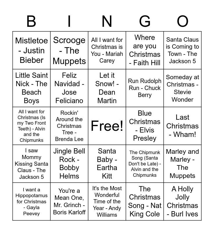 This bingo card has a free space and 29 words: I want a Hippopotamus for Christmas - Gayla Peevey, White Christmas - Bing Crosby, Rockin' Around the Christmas Tree - Brenda Lee, Underneath the Tree - Kelly Clarkson, Mistletoe - Justin Bieber, All I want for Christmas is You - Mariah Carey, Feliz Navidad - Jose Feliciano, Jingle Bell Rock - Bobby Helms, Blue Christmas - Elvis Presley, You're a Mean One, Mr. Grinch - Boris Karloff, Last Christmas - Wham!, A Holly Jolly Christmas - Burl Ives, It's the Most Wonderful Time of the Year - Andy Williams, The Christmas Song - Nat King Cole, Someday at Christmas - Stevie Wonder, Grandma got Run over by a Reindeer - Elmo & Patsy, Santa Baby - Eartha Kitt, I saw Mommy Kissing Santa Claus - The Jackson 5, Santa Claus is Coming to Town - The Jackson 5, All I want for Christmas (Is my Two Front Teeth) - Alvin and the Chipmunks, The Chipmunk Song (Santa Don't be Late) - Alvin and the Chipmunks, Frosty the Snowman - Jimmy Durante, Run Rudolph Run - Chuck Berry, Little Saint Nick - The Beach Boys, Where are you Christmas - Faith Hill, Scrooge - The Muppets, Marley and Marley - The Muppets, Let it Snow! - Dean Martin and Have Yourself a Merry Little Christmas - Frank Sinatra.