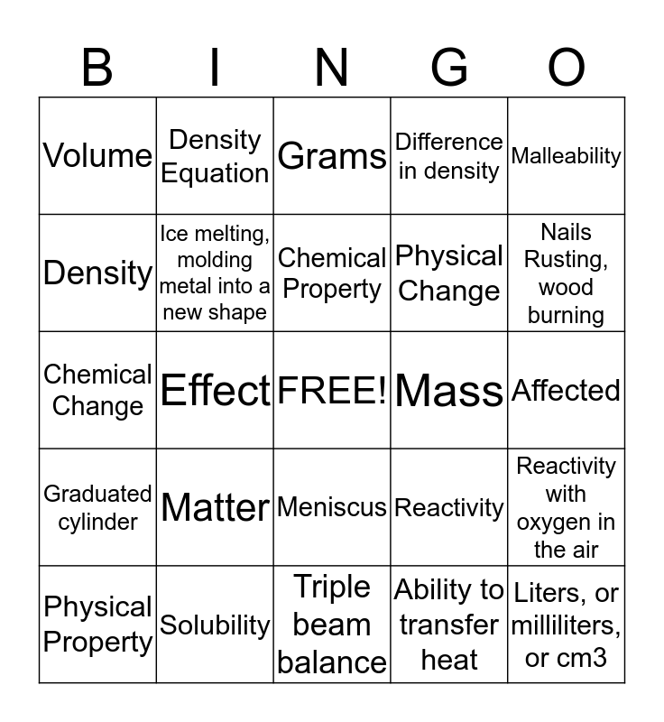 This bingo card has a free space and 24 words: Matter, Solubility, Chemical Property, Physical Property, Malleability, Volume, Density, Density Equation, Mass, Meniscus, Physical Change, Chemical Change, Reactivity, Reactivity with oxygen in the air, Ice melting, molding metal into a new shape, Ability to transfer heat, Affected, Grams, Nails Rusting, wood burning, Effect, Liters, or milliliters, or cm3, Graduated cylinder, Difference in density and Triple beam balance.
