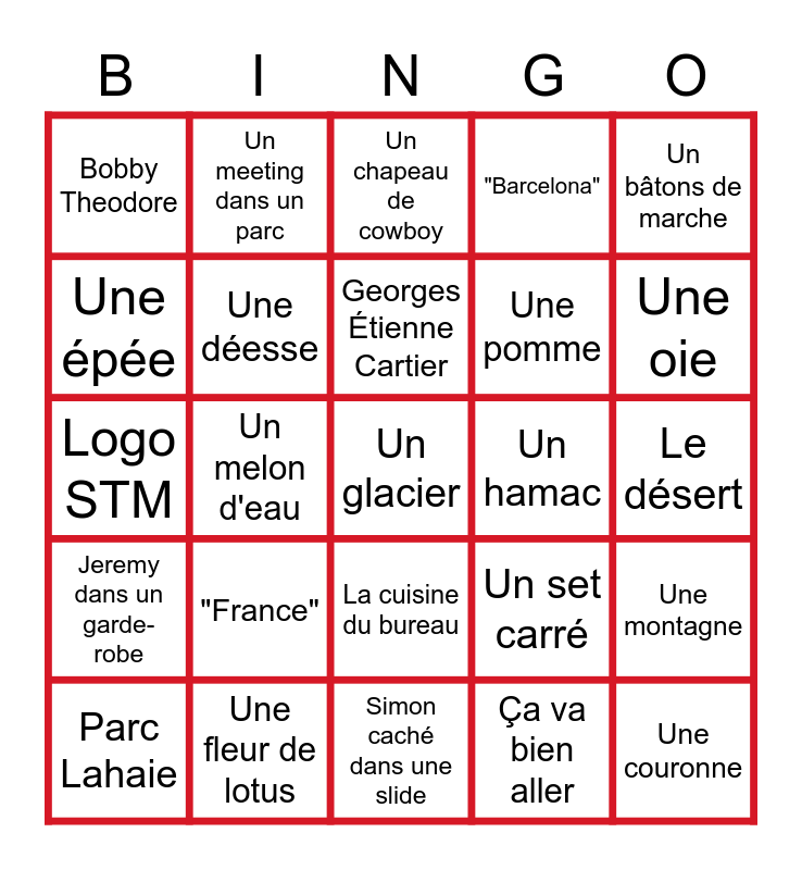 This bingo card has 75 words: Free!, Un vélo, Un chapeau de cowboy, Le vieux logo gsmprjct°, Un verre Tiki, Un chat, Jeanne Mance, Lunettes John Lennon, Un Moulin à vent, Des chips, Une couronne, Une Corona, Georges Étienne Cartier, Une épée, Une tequila, Un melon d'eau, Oscar, Un glacier, "Mute", Un bâtons de marche, Un arc-en-ciel, Logo STM, Une déesse, Un meeting dans un parc, "Barcelona", "Wow", "Métamorphose", Un toucan, Un Papillon, Des bulles, Une cathédrale, Un cône orange, Un pogo, Un set carré, Une oie, Une pomme, 355, Ste-Catherine, Un site archéologique, Le désert, Ça va bien aller, Un crâne, Des jumeaux, "Thailande", "Chine", "Bonjour", Wyatt Earp, Parc Lahaie, Bobby Theodore, Corey Timpson, :-), Une moustache, La cuisine du bureau, André Cointreau, Un cocktail shaker, Un masque, Un chandelier, Des lunettes de soleil, De la glace, "Sel Casher", Emoji <3, "France", Émoji 'applaudissement', Un banc rouge, Cheveux mauves, Étagère pleine de livres, Un hamac, Un Bébé, Un tattoo, Un avion, Une montagne, Jeremy dans un garde-robe, Une fleur de lotus, Une cannette de bière, Simon caché dans une slide and Quelqu'un avec une tuque.