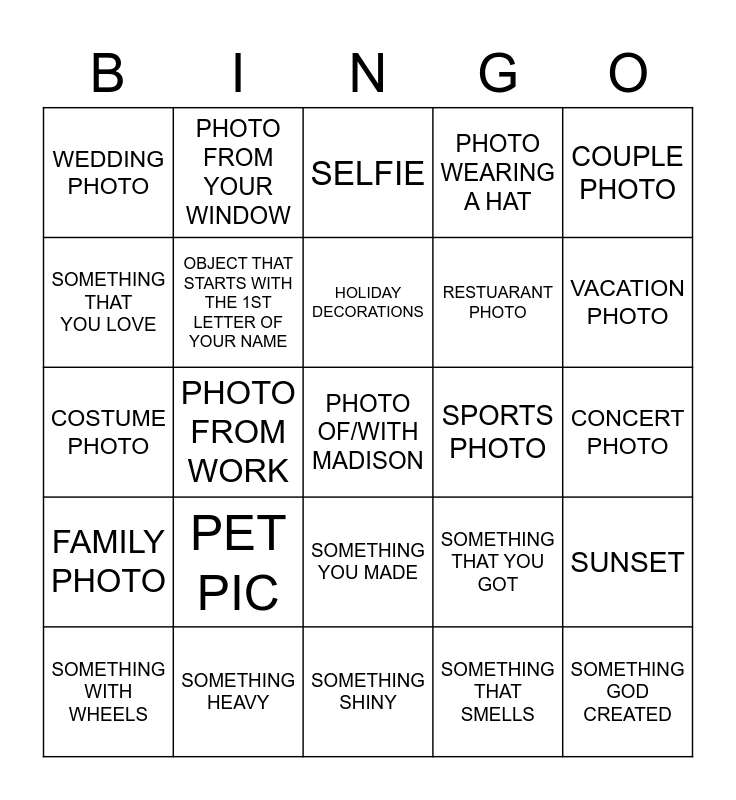 This bingo card has a free space and 24 words: PET PIC, SOMETHING HEAVY, HOLIDAY DECORATIONS, SOMETHING WITH WHEELS, COUPLE PHOTO, WEDDING PHOTO, SOMETHING THAT YOU LOVE, PHOTO FROM YOUR WINDOW, SPORTS PHOTO, SOMETHING YOU MADE, RESTUARANT PHOTO, COSTUME PHOTO, SOMETHING THAT YOU GOT, SUNSET, OBJECT THAT STARTS WITH THE 1ST LETTER OF YOUR NAME, SOMETHING THAT SMELLS, CONCERT PHOTO, SELFIE, VACATION PHOTO, PHOTO FROM WORK, SOMETHING GOD CREATED, FAMILY PHOTO, PHOTO WEARING A HAT and SOMETHING SHINY.