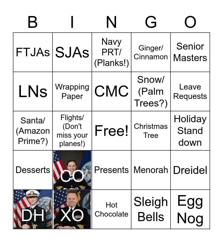 This bingo card has 3 images, a free space and 24 words: CO, XO, CMC, DH, Senior Masters, FTJAs, LNs, SJAs, Christmas Tree, Presents, Snow/ (Palm Trees?), Santa/ (Amazon Prime?), Menorah, Dreidel, Wrapping Paper, Sleigh Bells, Holiday Stand down, Navy PRT/ (Planks!), Leave Requests, Flights/ (Don't miss your planes!), Egg Nog, Desserts, Ginger/ Cinnamon and Hot Chocolate.