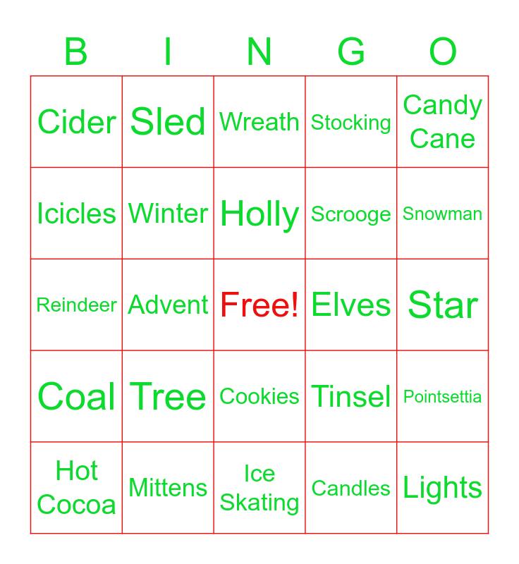 This bingo card has a free space and 44 words: Caroling, Lights, Snowflake, Hot Cocoa, Wrapping Paper, Candles, Wreath, Snow Globe, Candy Cane, Mittens, Stocking, Elves, Cookies, Tree, Scarf, Ice Skating, Skiing, Reindeer, Eggnog, Snowman, Sled, Cards, Nutmeg, Cider, Boots, Star, Snow, Elf on a Shelf, Tinsel, Coal, Ornaments, Pointsettia, Mistletoe, Goodwill, Advent, Chimney, Shopping, Presents, Holly, Icicles, Scrooge, Tradition, Winter and Sleighbells.
