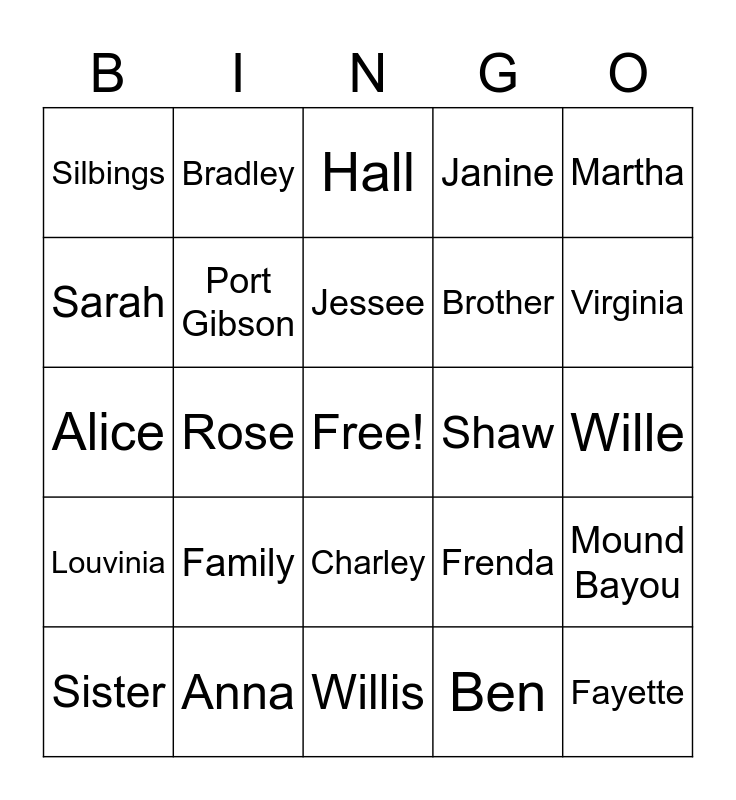This bingo card has a free space and 24 words: Family, Anna, Jessee, Sister, Martha, Silbings, Sarah, Bradley, Shaw, Charley, Brother, Alice, Frenda, Mound Bayou, Port Gibson, Ben, Wille, Hall, Virginia, Rose, Fayette, Louvinia, Janine and Willis.