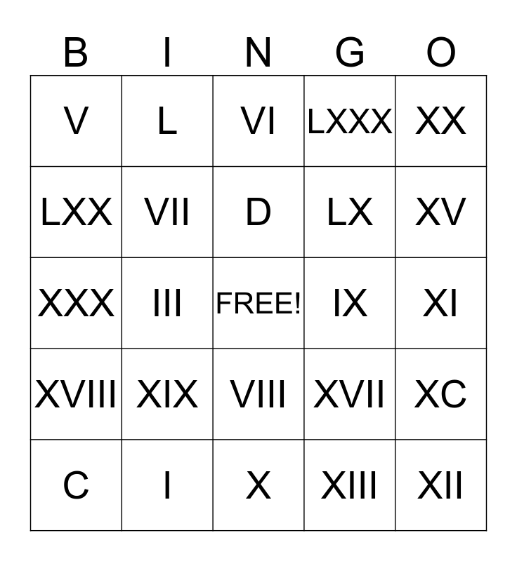 This bingo card has a free space and 30 words: I, II, III, IV, V, VI, VII, VIII, IX, X, XI, XII, XIII, XIV, XV, XVI, XVII, XVIII, XIX, XX, XXX, XL, L, LX, LXX, LXXX, XC, C, D and M.