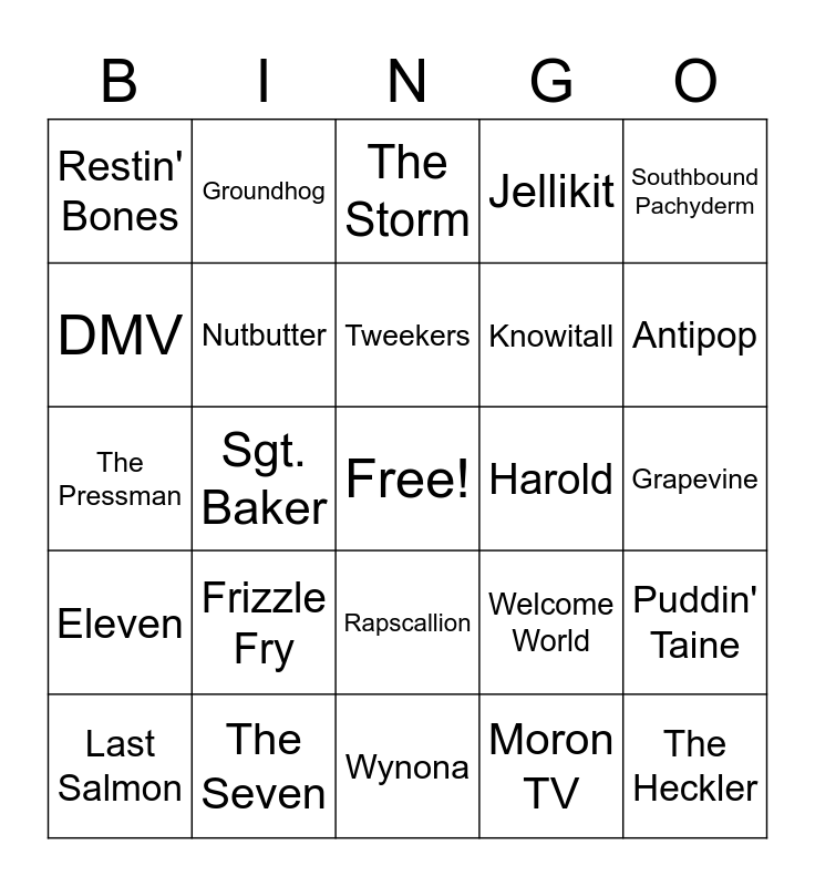 This bingo card has a free space and 24 words: Frizzle Fry, The Seven, Tweekers, Last Salmon, Southbound Pachyderm, Restin' Bones, DMV, Groundhog, Harold, Rapscallion, Knowitall, The Pressman, Welcome World, Puddin' Taine, Nutbutter, Moron TV, Grapevine, The Storm, Antipop, Sgt. Baker, The Heckler, Eleven, Jellikit and Wynona.