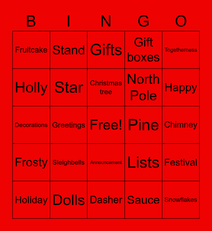 This bingo card has a free space and 91 words: Advent, Angels, Announcement, Bells, Bethlehem, Blitzen, Candles, Candy, Candy canes, Cards, Cedar, Celebrate, Ceremonies, Chimney, Christmas cookies, Christmas tree, Cold, Comet, Cranberry sauce, Crowds, Cupid, Dancer, Dasher, December, Decorations, Dolls, Donner, Dressing, Eggnog, Elves, Family reunion, Festival, Fir, Frosty, Fruitcake, Gift boxes, Gifts, Goodwill, Greetings, Happy, Holiday, Holly, Icicles, Jolly, Lights, Lists, Merry, Miracle, Mistletoe, New Year, Noel, North Pole, Pageant, Parades, Party, Pie, Pine, Plum pudding, Presents, Pumpkin pie, Punch, Red/green, Reindeer, Ribbon, Rudolph, Sacred, Sales, Sauce, Season, Sled, Sleighbells, Snowflakes, Spirit, St. Nick, Stand, Star, Stickers, Stocking stuffers, Sweet potato, Tidings, Tinsel, Togetherness, Toys, Tradition, Traffic, Trips, Turkey, Vacation, Winter, Worship and Wrapping paper.