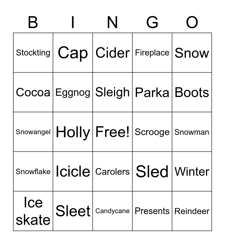 This bingo card has a free space and 30 words: Sleet, Blanket, Holly, Mistletoe, Stockting, Cider, Eggnog, Carolers, Scrooge, Candycane, Snowman, Reindeer, Presents, Chimney, Boots, Mittens, Sled, Snowflake, Icicle, Snow, Snowangel, Snowball, Cap, Parka, Cocoa, Fireplace, Winter, Ice skate, Sleigh and Snowmobile.