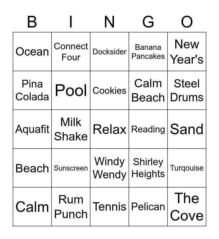 This bingo card has a free space and 54 words: Coco's, Beach, Swimming, Windy, Windy Wendy, Breezy, Banana Pancakes, Volleyball, Pina Colada, Dock, Ocean, Kids Club, Rum Punch, Calm, Snorkel, Tennis, The Cove, Calm Beach, Dock Jump, Sand, Shirley Heights, Happy, Reading, New Year's, Buffet, Connect Four, Fruit Loops, StingRay, Turtle, Pelican, English Harbour, Pirate, BBQ, Fish Sandwich, Docksider, Power Walk, Aquafit, Turqouise, Palm Tree, Pool, Golf Cart, FlipFlop, Swimsuit, Sunhat, Sunscreen, Beach Chair, Rainbow Garden, Tea Time, Cookies, Milk Shake, Steel Drums, Fresh Fish, Drink Cart and Mamora Bay Cafe.