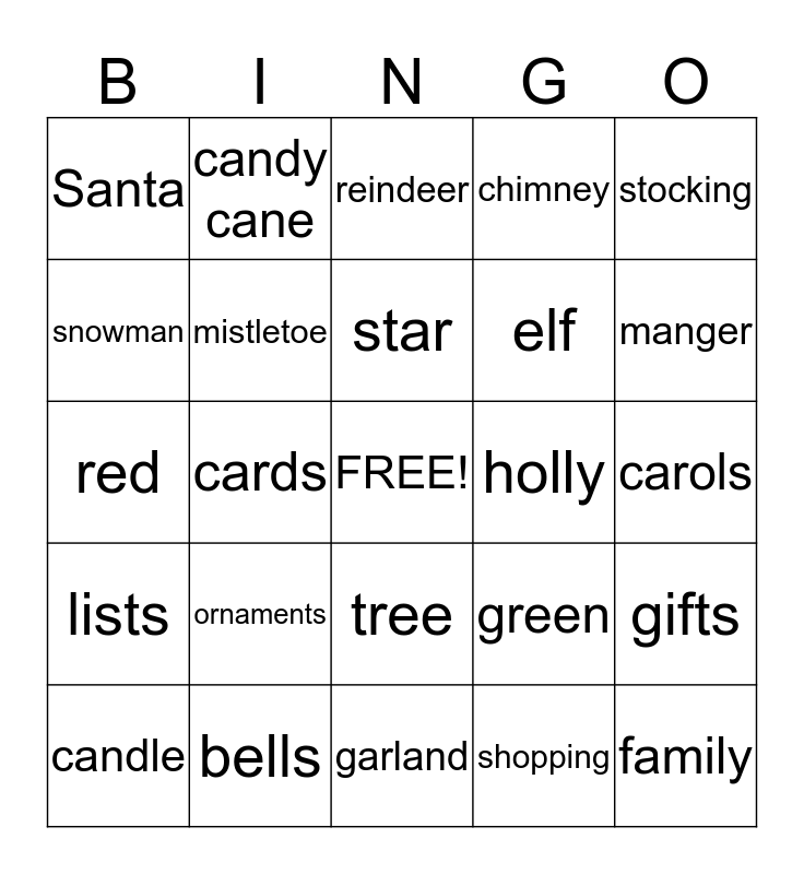This bingo card has a free space and 24 words: ornaments, bells, star, candle, stocking, Santa, snowman, candy cane, holly, tree, elf, red, green, gifts, mistletoe, shopping, carols, reindeer, manger, cards, family, lists, chimney and garland.