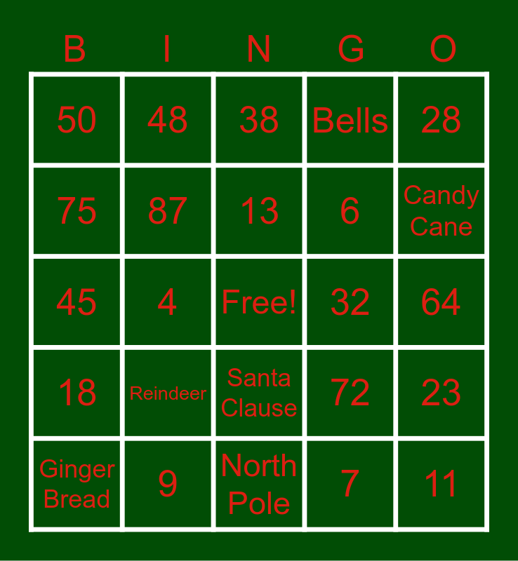 This bingo card has 40 words: 23, 4, 90, 72, 11, 45, 87, 3, 6, 23, 50, 48, Free!, 7, 64, 75, 24, 38, 55, 28, 18, 9, 13, 32, 0, Tree, Mistletoe, Presents, Star, Hot chocolate, Lights, Reindeer, Santa Clause, Peppermint, Candy Cane, Ginger Bread, Toys, North Pole, Bells and Elves.