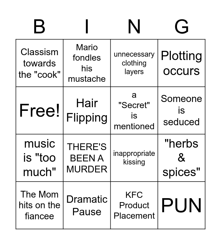This bingo card has 16 words: Dramatic Pause, "herbs & spices", unnecessary clothing layers, Classism towards the "cook", music is "too much", Mario fondles his mustache, inappropriate kissing, KFC Product Placement, Free!, Hair Flipping, The Mom hits on the fiancee, Plotting occurs, THERE'S BEEN A MURDER, Someone is seduced, a "Secret" is mentioned and PUN.