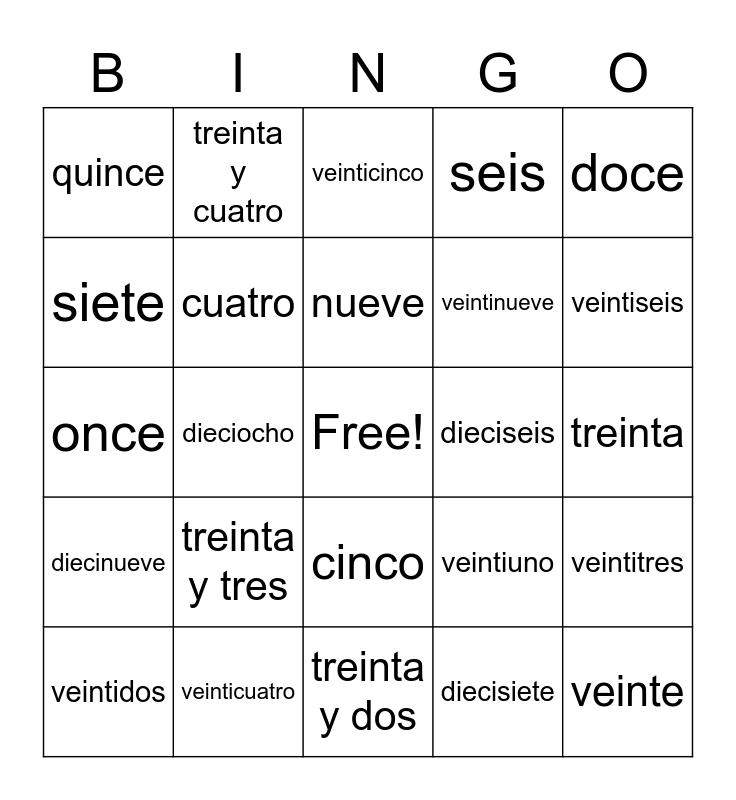 This bingo card has a free space and 35 words: uno, dos, tres, cuatro, cinco, seis, siete, ocho, nueve, diez, once, doce, trece, catorce, quince, dieciseis, diecisiete, dieciocho, diecinueve, veinte, veintiuno, veintidos, veintitres, veinticuatro, veinticinco, veintiseis, veintisiete, veintiocho, veintinueve, treinta, treinta y uno, treinta y dos, treinta y tres, treinta y cuatro and treinta y cinco.