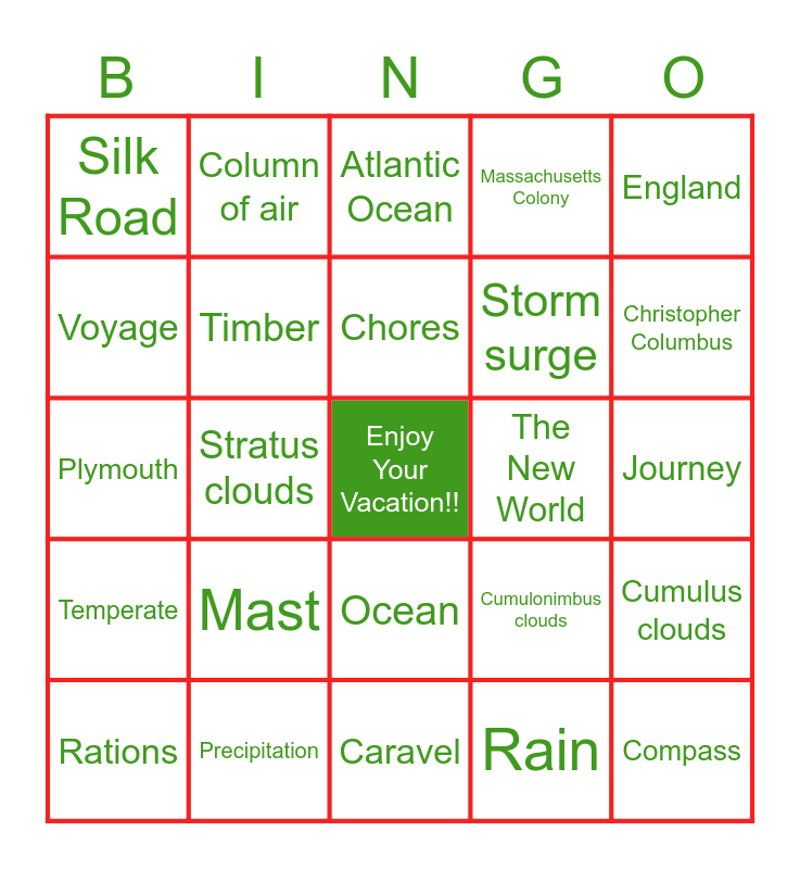This bingo card has a free space and 78 words: Religious Freedom, Representative, Atlantic Ocean, Pilgrims, Compact, The Mayflower, Squanto, Wampanoag Tribe, North, East, South, West, Massachusetts Colony, Silk Road, Overcrowded, Voyage, November 11, 1620, Mast, Typical, Journey, Separatist, England, Plymouth, Chores, Timber, Harmonious, Disease, Poor soil, Hardship, Illness, Christopher Columbus, Jewelry, Caravel, Navigation, Rations, The New World, Asia, Map, Telescope, Compass, Trade, Tornado of 1953, Blizzard of 1978, Gable roof, Hip Roof, Column of air, Cave In, White out, Cloud cover, Cirrus clouds, Cumulus clouds, Stratus clouds, Cumulonimbus clouds, Visibility, Moisture, Hurricane, Extreme, Spiraling, Eye, Ocean, Storm surge, Flood, Destruction, Destructive, Weather, Climate, Polar, Tropical, Temperate, Precipitation, Humidity, Water vapor, Thermometer, Barometer, Rain, Snow, Hail and Sleet.