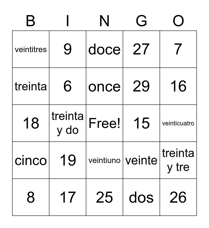 This bingo card has a free space and 34 words: uno, dos, tres, cuatro, cinco, 6, 7, 8, 9, 10, once, doce, trece, catorce, 15, 16, 17, 18, 19, veinte, veintiuno, veintidos, veintitres, veinticuatro, 25, 26, 27, 28, 29, treinta, treinta y uno, treinta y do, treinta y tre and treinta y cuatro.
