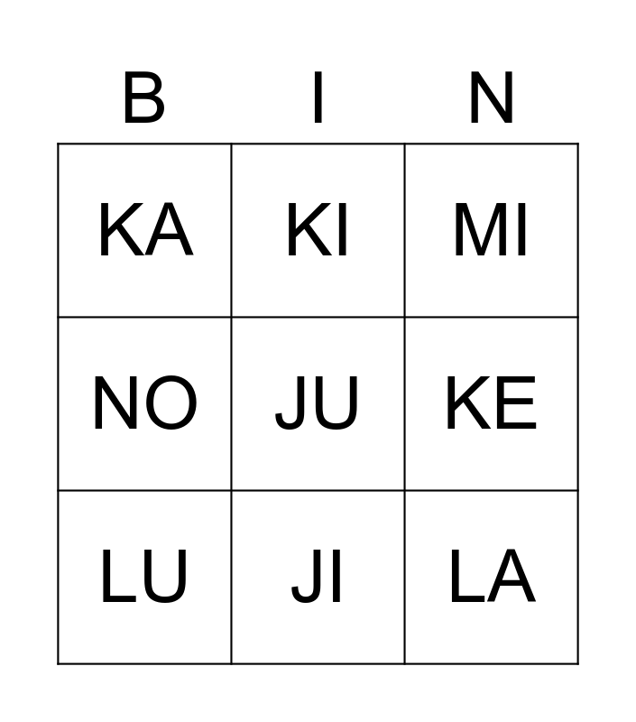 This bingo card has 25 words: JA, JE, JI, JO, JU, KA, KE, KI, KO, KU, LA, LE, LI, LO, LU, MA, ME, MI, MO, MU, NA, NE, NI, NO and NU.