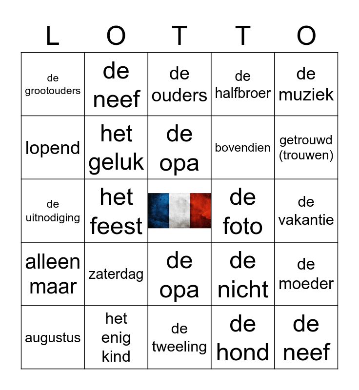 This bingo card has a free space and 99 words: het gezin, de familie, de broer, de zus, de ouders, het kind, de vader, de moeder, papa, mama, de zoon, de dochter, de oom, de tante, de opa, de oma, de grootouders, de neef, de nicht, getrouwd (trouwen), gescheiden (scheiden), het gezin, de familie, de broer, de zus, de ouders, de vader, de moeder, de opa, de oma, het jaar, beste, de tweeling, de hond, morgen, de verjaardag, het feest, de uitnodiging, uitnodigen, dansen, eten, zaterdag, gescheiden (scheiden), getrouwd (trouwen), de halfbroer, het enig kind, alleen, het kind, de buurvrouw, het weekend, de buurman, de oom, de tante, de neef, de nicht, de vriend, de vriendin, de trein, wacht! (wachten op), de boodschap, luisteren (naar), de slaapkamer, organiseren, welke, oud, het dier, dol zijn op, de muziek, bij (thuis), schattig, de metro, alleen maar, naar huis gaan, bovendien, lopend, de kat, de maand, de dag, het geluk, het nummer, geweldig, zoals, de foto, klaargemaakt, voorbereid (klaarmaken, voorbereiden), goed, lekker, de taart, de bloem, zij lacht (lachen), de man, echtgenoot, grappig, de vakantie, augustus, mama, de olijf, op, de tafel, iedereen, altijd, aardig, lievelings- and sinds.