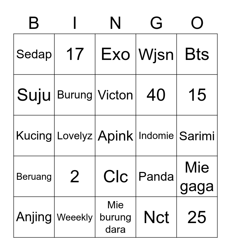 This bingo card has a free space and 24 words: 2, Weeekly, Victon, Anjing, Bts, Sedap, Suju, 17, Indomie, Clc, 40, Kucing, Panda, Mie gaga, Burung, Nct, Sarimi, Exo, 15, Lovelyz, 25, Beruang, Wjsn and Mie burung dara.