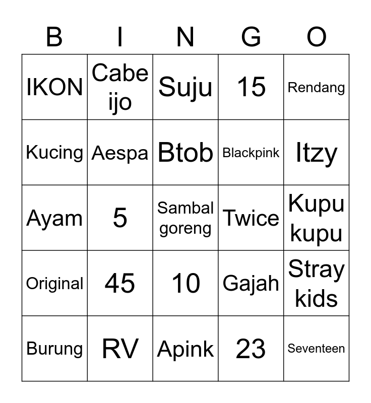 This bingo card has a free space and 24 words: 45, RV, Btob, Burung, Rendang, IKON, Kucing, Cabe ijo, Twice, 10, Blackpink, Ayam, Gajah, Stray kids, Aespa, 23, Kupu kupu, Suju, Itzy, 5, Seventeen, Original, 15 and Apink.