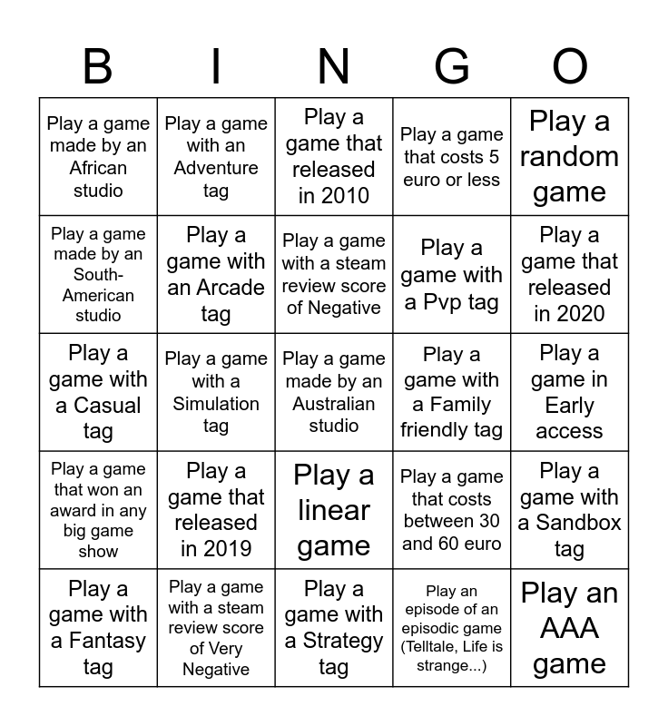 This bingo card has 103 words: Free!, Play the first game you ever owned on steam, Play a random game, Play a game that a friend wrote a steam review about, Play a game that a friend recently played, Play a game that is featured on the front page, Play a game that released today, Play a game that released this week, Play a game that released this month, Play a game that released this year, Play a game that released in 2004, Play a game that released in 2005, Play a game that released in 2006, Play a game that released in 2007, Play a game that released in 2008, Play a game that released in 2009, Play a game that released in 2010, Play a game that released in 2011, Play a game that released in 2012, Play a game that released in 2013, Play a game that released in 2014, Play a game that released in 2015, Play a game that released in 2016, Play a game that released in 2017, Play a game that released in 2018, Play a game that released in 2019, Play a game that released in 2020, Play a game that costs 5 euro or less, Play a game that costs between 5 and 10 euro, Play a game that costs between 10 and 30 euro, Play a game that costs between 30 and 60 euro, Play an episode of an episodic game (Telltale, Life is strange...), Play a game with a steam review score of Overwhelmingly positive, Play a game with a steam review score of Very positive, Play a game with a steam review score of Positive, Play a game with a steam review score of Mostily positive, Play a game with a steam review score of Mixed, Play a game with a steam review score of Mostily negative, Play a game with a steam review score of Negative, Play a game with a steam review score of Very Negative, Play a game with a steam review score of Overwhelmingly Negative, Play a game that won an award in any big game show, Play a game made by an American studio, Play a game made by an South-American studio, Play a game made by an European studio, Play a game made by an African studio, Play a game made by an Asian studio, Play a game made by an Australian studio, Play an indie game, Play an AAA game, Play any game with 3D graphics, Play any game with 2D graphics, Play any game with pixel graphics, Play a first person game, Play a third person game, Play a top down game, Play a side scroller game, Play a vr game, Play an open world game, Play a linear game, Play a game in Early access, Play a free to play game, Play a Single player game, Play a Online Multiplayer game, Play a Massive multiplayer online game, Play a co-op game, Play a game with an Action tag, Play a game with an Adventure tag, Play a game with a Casual tag, Play a game with a Simulation tag, Play a game with a Strategy tag, Play a game with a RPG tag, Play a game with a Sport tag, Play a game with a Racing tag, Play a game with a Puzzle tag, Play a game with a Nudity tag, Play a game with a Story rich tag, Play a game with a Fantasy tag, Play a game with an Anime tag, Play a game with a Sci-fi tag, Play a game with a Horror tag, Play a game with a Shooter tag, Play a game with an Arcade tag, Play a game with a Retro tag, Play a game with a Family friendly tag, Play a game with an Exploration tag, Play a game with a Platformer tag, Play a game with a Survival tag, Play a game with a Relaxing tag, Play a game with a Comedy tag, Play a game with a Female protagonist tag, Play a game with a Visual novel tag, Play a game with a Sandbox tag, Play a game with a Turned-based tag, Play a game with a Physics tag, Play a game with a Realistic tag, Play a game with a Pvp tag, Play a game with a Choices Matter tag, Play a game with a Psychological Horror tag, Play a game with a Dark tag, Play a game with a Space tag, Play a game with a Mystery tag and Play a game with a Point & click tag.