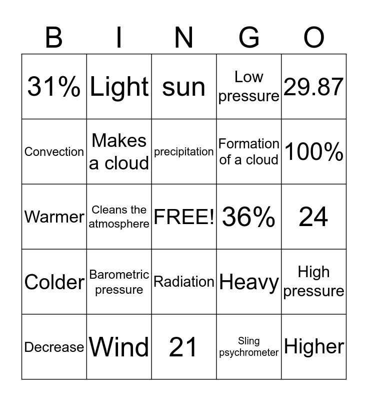 This bingo card has a free space and 27 words: Heavy, 67 %, Formation of a cloud, 21, Convection, sun, Light, Colder, 36%, High pressure, Warmer, Low pressure, Decrease, Wind, 100%, Anemometer, Makes a cloud, precipitation, Barometric pressure, 31%, 24, Sling psychrometer, Cleans the atmosphere, Higher, Radiation, 29.87 and Conduction.
