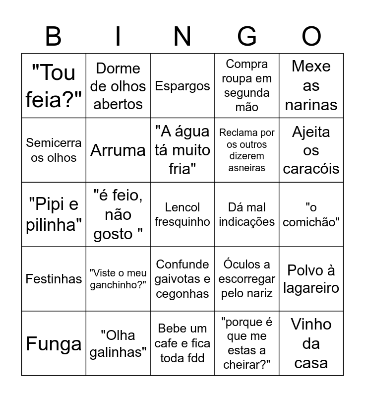 This bingo card has a free space and 24 words: "Viste o meu ganchinho?", "Olha galinhas", "A água tá muito fria", Funga, Mexe as narinas, "Tou feia?", Semicerra os olhos, Dorme de olhos abertos, Dá mal indicações, Confunde gaivotas e cegonhas, Reclama por os outros dizerem asneiras, "Pipi e pilinha", Óculos a escorregar pelo nariz, Polvo à lagareiro, Arruma, "porque é que me estas a cheirar?", "o comichão", Espargos, Ajeita os caracóis, "é feio, não gosto ", Vinho da casa, Festinhas, Compra roupa em segunda mão and Bebe um cafe e fica toda fdd.