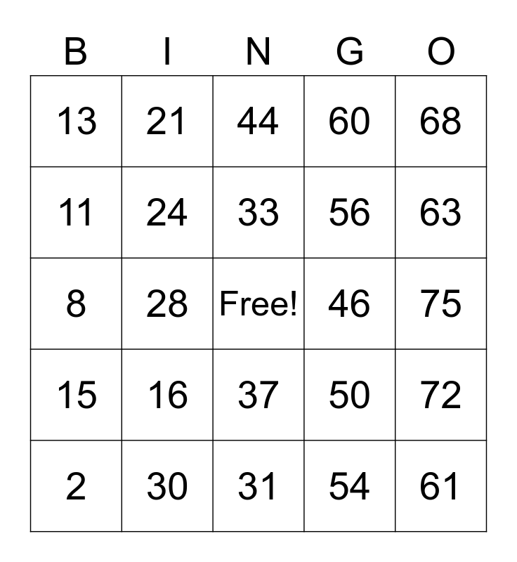 This bingo card has a free space and 24 words: 2, 16, 33, 54, 68, 13, 21, 44, 46, 75, 8, 24, 50, 72, 11, 30, 31, 60, 63, 15, 28, 37, 56 and 61.