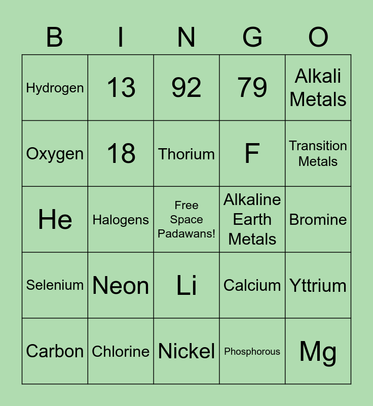 This bingo card has a free space and 29 words: Carbon, B, Halogens, 47, Hydrogen, 92, 18, Neon, Alkaline Earth Metals, Chlorine, Bromine, Mg, Nickel, Phosphorous, Transition Metals, Potassium, Li, Selenium, Alkali Metals, He, Calcium, Noble Gases, F, Oxygen, 79, 13, Yttrium, Thorium and Xe.