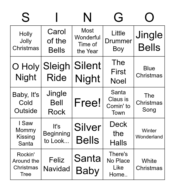 This bingo card has a free space and 29 words: Rockin' Around the Christmas Tree, All I Want for Christmas is You, Jingle Bell Rock, Let it Snow!, Holly Jolly Christmas, Most Wonderful Time of the Year, Sleigh Ride, It's Beginning to Look..., Santa Claus is Comin' to Town, Feliz Navidad, The Christmas Song, White Christmas, Santa Baby, There's No Place Like Home.., Blue Christmas, Mele Kalikimaka, Silver Bells, I Saw Mommy Kissing Santa, Jingle Bells, Baby, It's Cold Outside, Deck the Halls, I Got My Love to Keep Me Warm, The First Noel, O Holy Night, Little Drummer Boy, Carol of the Bells, Winter Wonderland, Silent Night and O Tannenbaum.