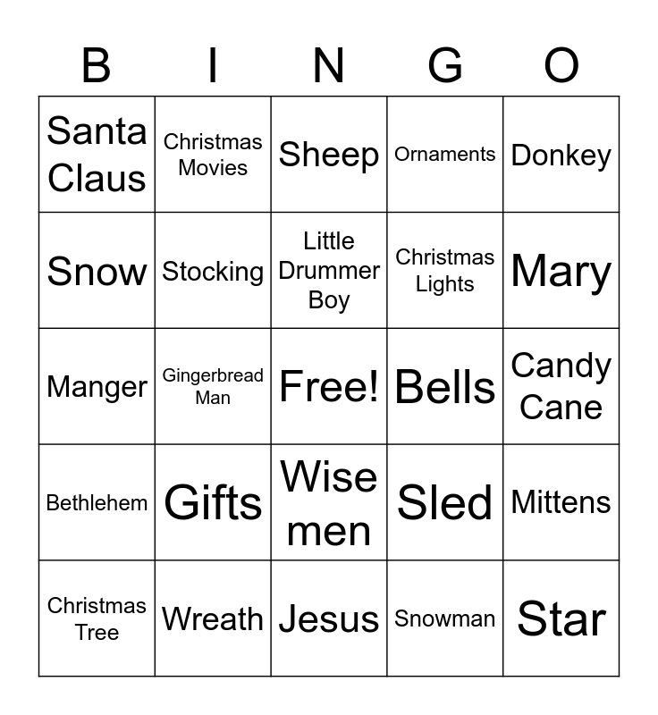 This bingo card has a free space and 29 words: Christmas Tree, Reindeer, Gingerbread Man, Elf, Santa Claus, Sheep, Stocking, Gifts, Bells, Wreath, Candy Cane, Star, Jesus, Snowman, Mary, Shepherds, Wise men, Bethlehem, Donkey, Manger, Sled, Hot Chocolate, Christmas Lights, Snow, Ornaments, Christmas Movies, Mittens, Little Drummer Boy and Advent Wreath.