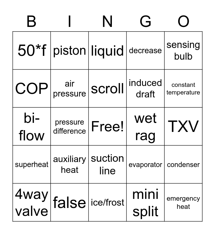 This bingo card has a free space and 29 words: 4way valve, absorbed, pressure difference, vapor, 50*f, liquid, air pressure, auxiliary heat, wet rag, false, TXV, emergency heat, ice/frost, mini split, constant temperature, air-to-air, suction line, superheat, sensing bulb, bi-flow, evaporator, balance point, induced draft, COP, decrease, piston, condenser, scroll and vapor-charged.