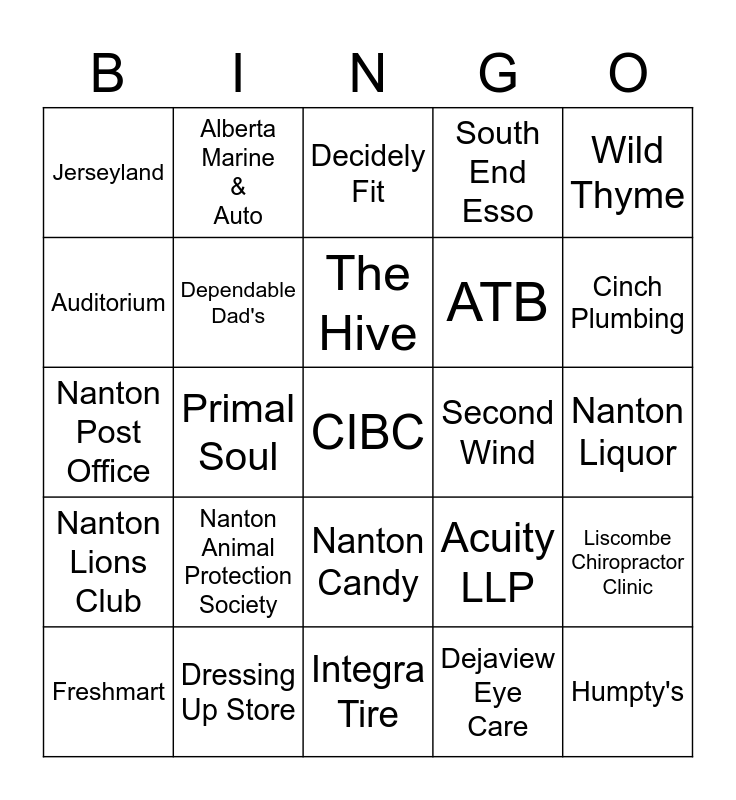 This bingo card has a free space and 74 words: Because I Said So, euro PRODUCTIONS Entertainment Services, The Hive, Georgie's Cafe, Stuthorne's, GCS Automotive, Brisket Case, Sandstone Pharmacy, Home Hardware, Sweet Queen, Freshmart, Chinook Financial, ATB, Wild Thyme, Haywired, Dressing Up Store, Fish Hook Custom, Second Wind, Sentimental Journey's, Jerseyland, Primal Soul, Decidely Fit, South End Esso, Nanton Liquor, Auditorium, Nanton Water, Raffin Transit, Juniper Flower, Circle K, Jennifer Handley Re/Max First, Dependable Dad's, Cattleman's Corner, Tim Hortons, Subway, Dairy Queen, Ken's Restaurant, Palace Liquor & Cannabis, Papa John's, Humpty's, Flying J, Market On Main, Nanton Candy, Nanton Yoga, Willow Creek Forge, NAPA Auto Parts, Alberta Marine & Auto, Cowboy Country Western Store, Mosaic Art & Gift Gallery, Details Hair Design, Baba Kay's, UFA, TSI Yardworks, Acuity LLP, 2W Livestock Equipment, Bomber Command Museum, Hicklin Motors, Integra Tire, Magnum Trailers, Sieben's Nanton, Nanton Lions Club, Nanton Animal Protection Society, Canadian Grain Elevator Discovery Centre, Dejaview Eye Care, Liscombe Chiropractor Clinic, Nanton Post Office, Nanton Dental, G&JD Construction, Trains Lawncare, Cinch Plumbing, Bub's Classic Grille, Nanton Golf Club, Claudia's Choices, Gump Dump and Critters Contracting.