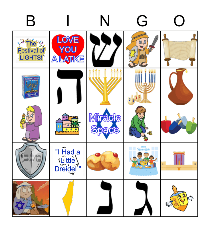 This bingo card has 31 images, a free space and 2 words: Hanukkah Oh Hanukkah and LOVE YOU A LATKE.