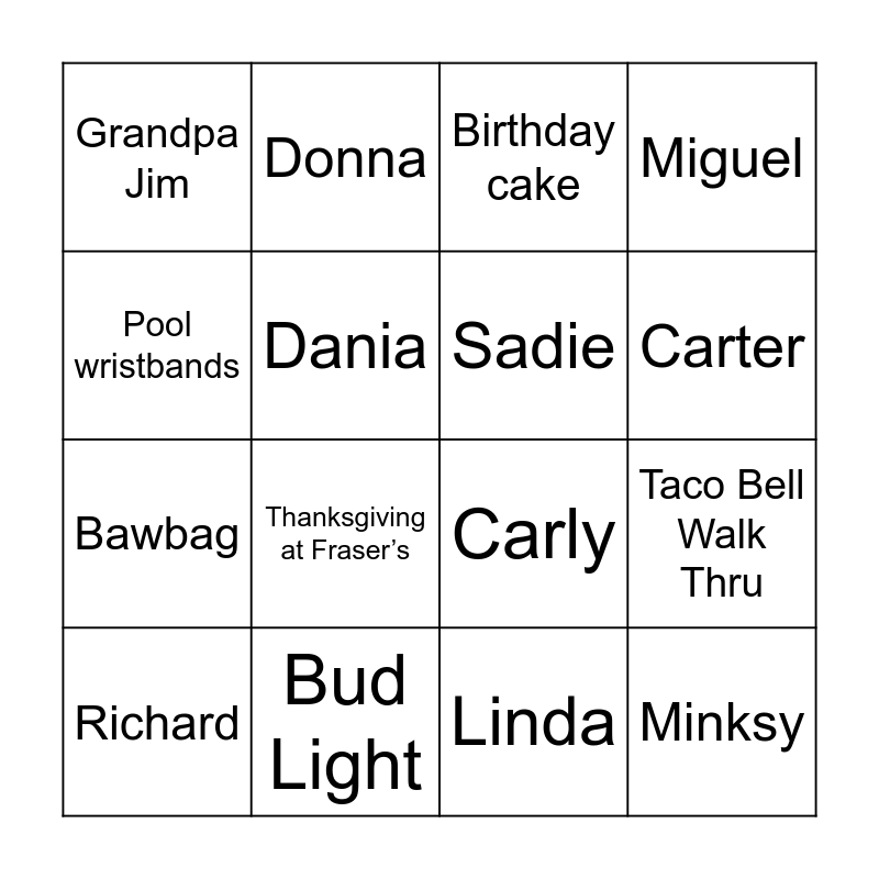 This bingo card has 50 words: Telfair Lofts, Richard, Paul’s red shirt, Mayor of Telfair, Daniel, Broken hot tub, Donna, Jackson, Dania, Grant, Sadie, Miguel, Diego, Katie, Ryan, Simon, Carter, Bud Light, Grillin’ on a Sunday, Pool wristbands, Taco Bell Walk Thru, Fraser, Grandpa Jim, Bawbag, Fire of 2018, Canyon Lake, Thanksgiving at Fraser’s, Galveston, Birthday cake, Wisconsin, Monterrey, Bassett Hollow, Harvey, Big Ben, Joe, White Elephant, Mint Juleps, Wimberly, Scotland, Linda, Fort Bend County, Sugar Land, Loteria, Traeger Grill, Salsa Bowl, Carly, Walter, Terry, Minksy and Gilbert.