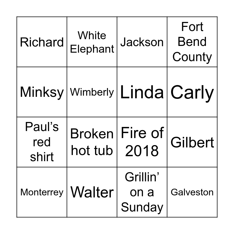 This bingo card has 50 words: Wisconsin, Monterrey, Bassett Hollow, Harvey, Big Ben, Joe, White Elephant, Mint Juleps, Wimberly, Scotland, Linda, Fort Bend County, Sugar Land, Loteria, Traeger Grill, Salsa Bowl, Carly, Walter, Terry, Minksy, Gilbert, Telfair Lofts, Richard, Paul’s red shirt, Mayor of Telfair, Daniel, Broken hot tub, Donna, Jackson, Dania, Grant, Sadie, Miguel, Diego, Katie, Ryan, Simon, Carter, Bud Light, Grillin’ on a Sunday, Pool wristbands, Taco Bell Walk Thru, Fraser, Grandpa Jim, Bawbag, Fire of 2018, Canyon Lake, Thanksgiving at Fraser’s, Galveston and Birthday cake.