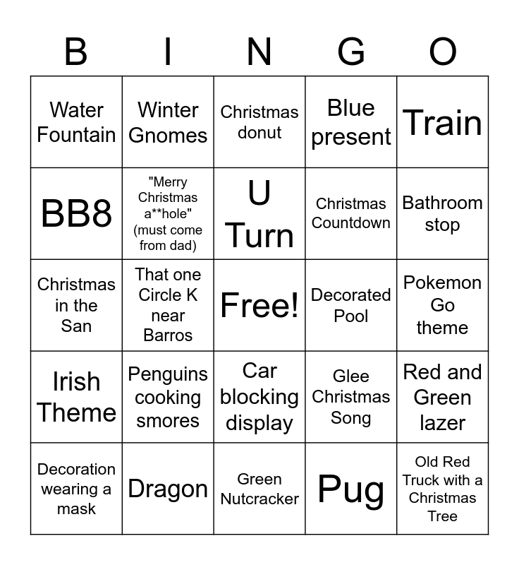 This bingo card has a free space and 24 words: Penguins cooking smores, Dragon, U Turn, Decoration wearing a mask, Train, Water Fountain, BB8, Winter Gnomes, Decorated Pool, Car blocking display, Christmas Countdown, Christmas in the San, Glee Christmas Song, Red and Green lazer, "Merry Christmas a**hole" (must come from dad), Pug, Pokemon Go theme, Christmas donut, Bathroom stop, That one Circle K near Barros, Old Red Truck with a Christmas Tree, Irish Theme, Blue present and Green Nutcracker.