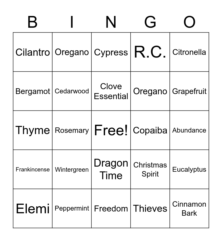 This bingo card has a free space and 61 words: Lavender, Peppermint, Lemon, Frankincense, Thieves, Lemongrass, Cedarwood, Vetiver, Oregano, Grapefruit, R.C., Basil, Bergamot, Black Pepper, Cedarwood, Cilantro, Cinnamon Bark, Citronella, Clary Sage, Clove Essential, Copaiba, Cypress, Elemi, Eucalyptus, Frankincense, Geranium, Ginger, German Chamomile, Grapefruit, Helichrysum, Lime, Majoram, Myrrh, Orange, Oregano, Parsley, Patchouli, Rosemary, Spearmint, Thyme, Vetiver, Wintergreen, Abundance, Aroma Siez, Christmas Spirit, Citrus Fresh, Deep Relief, Breathe Again, DiGize, Dragon Time, Freedom, KidScents, Melrose, PanAway, Peace & Calming, Purification, Raven, Stress Away, Thieves, Valor and White Angelica.