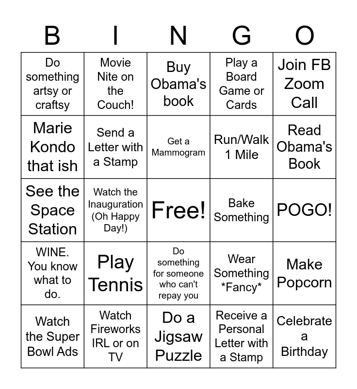 This bingo card has a free space and 24 words: Play Tennis, Watch Fireworks IRL or on TV, Get a Mammogram, Watch the Super Bowl Ads, Join FB Zoom Call, Do something artsy or craftsy, Marie Kondo that ish, Movie Nite on the Couch!, Bake Something, Do something for someone who can't repay you, Run/Walk 1 Mile, See the Space Station, Wear Something *Fancy*, Make Popcorn, Send a Letter with a Stamp, Receive a Personal Letter with a Stamp, POGO!, Buy Obama's book, Read Obama's Book, Watch the Inauguration (Oh Happy Day!), Celebrate a Birthday, WINE. You know what to do., Play a Board Game or Cards and Do a Jigsaw Puzzle.