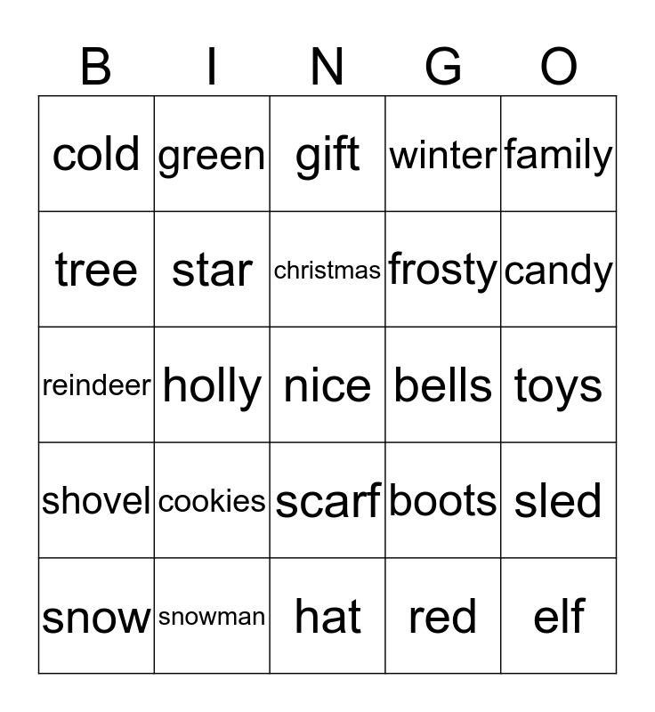 This bingo card has a free space and 24 words: cookies, snowman, christmas, snow, family, cold, tree, green, bells, scarf, frosty, reindeer, boots, sled, star, red, toys, gift, candy, holly, elf, shovel, winter and hat.