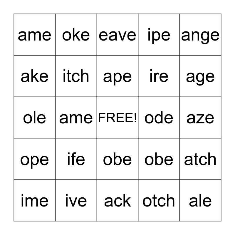 This bingo card has a free space and 24 words: ife, ive, ape, ime, ange, ame, ake, oke, ode, obe, ire, ole, obe, atch, itch, otch, aze, eave, age, ame, ale, ope, ipe and ack.