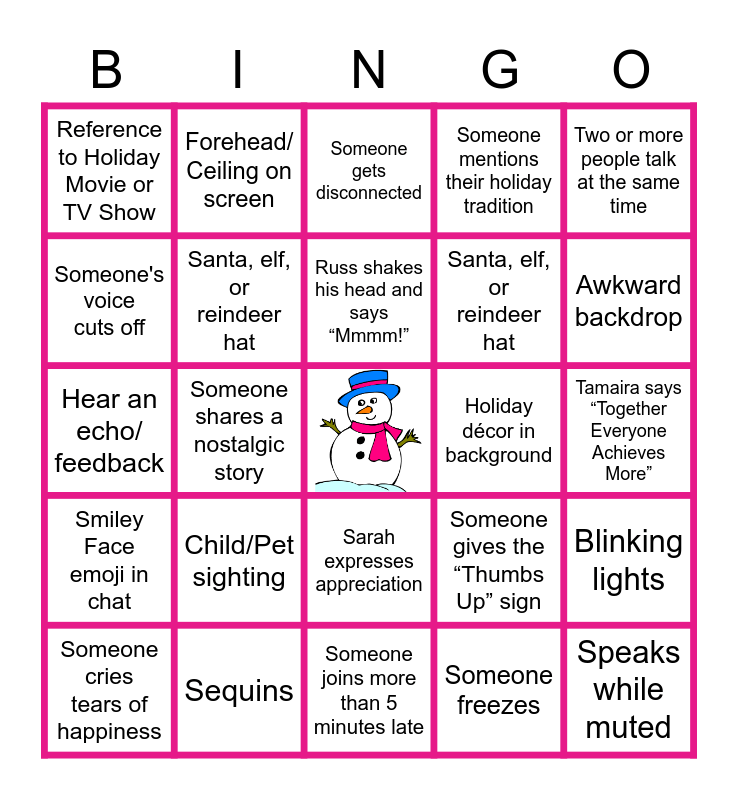 This bingo card has 1 images, a free space and 24 words: Child/Pet sighting, Sequins, Russ shakes his head and says “Mmmm!”, Someone cries tears of happiness, Two or more people talk at the same time, Reference to Holiday Movie or TV Show, Someone's voice cuts off, Forehead/ Ceiling on screen, Holiday décor in background, Sarah expresses appreciation, Santa, elf, or reindeer hat, Hear an echo/ feedback, Someone gives the “Thumbs Up” sign, Blinking lights, Santa, elf, or reindeer hat, Someone freezes, Tamaira says “Together Everyone Achieves More”, Someone gets disconnected, Awkward backdrop, Someone shares a nostalgic story, Speaks while muted, Smiley Face emoji in chat, Someone mentions their holiday tradition and Someone joins more than 5 minutes late.