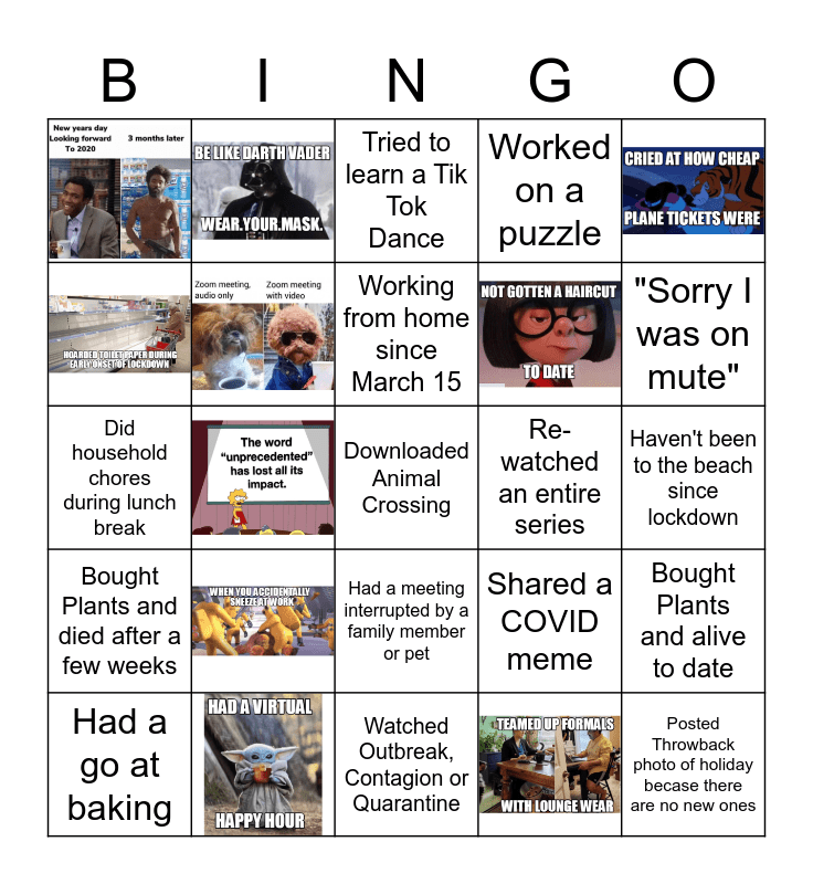 This bingo card has 12 images and 18 words: Joined a virtual fitness class, Tried to learn a Tik Tok Dance, Had a meeting interrupted by a family member or pet, Re-watched an entire series, Watched Outbreak, Contagion or Quarantine, Haven't been to the beach since lockdown, Downloaded Animal Crossing, Posted Throwback photo of holiday becase there are no new ones, "Sorry I was on mute", Shared a COVID meme, Bought Plants and died after a few weeks, Did household chores during lunch break, Dining table as my new "office workspace", Worked on a puzzle, Bought Plants and alive to date, Had a go at baking, Working from home since March 15 and Miss seeing colleagues in the office.