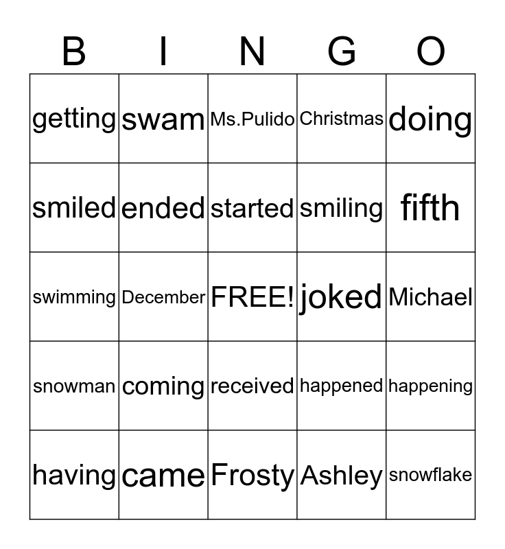 This bingo card has a free space and 24 words: coming, came, started, having, doing, getting, smiled, swam, joked, received, smiling, swimming, happened, happening, ended, Ashley, Michael, Ms.Pulido, fifth, December, snowflake, snowman, Christmas and Frosty.