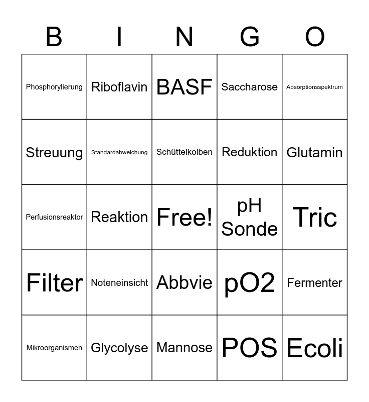 This bingo card has a free space and 53 words: Liste Wörter:, Ecoli, Corona Semester, POS, Noteneinsicht, AL1 /2 (AN ½), Riboflavin, Präzision, Streuung, Mittelwert, Standardabweichung, Zellkultur, Fermenter, pO2, CO2, Mikroorganismen, Schüttelkolben, pH Sonde, Photometer, Absorptionsspektrum, Reaktion, Oxidation, Reduktion, Phosphorylierung, Citrat Zyklus, Glycolyse, Glycolisierung, Glyconeogenese, Lactat, Glutamin, Peptidkette, Ester, Ether, Destillation, Feed, Glucose, Saccharose, Mannose, BASF, BioNTECH, Sars-Covid-19, Trump vs Biden, Tric, Octapharma, Merck, Abbvie, STR, CSTR, Perfusionsreaktor, Filter, Laminar Flow (Typ 2), Autoklav and ?Petrischale.