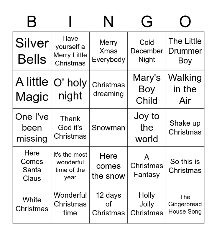 This bingo card has 25 words: It's the most wonderful time of the year, 12 days of Christmas, Christmas dreaming, White Christmas, The Little Drummer Boy, Silver Bells, A little Magic, Have yourself a Merry Little Christmas, Joy to the world, Here comes the snow, Mary's Boy Child, One I've been missing, A Christmas Fantasy, So this is Christmas, O' holy night, The Gingerbread House Song, Shake up Christmas, Merry Xmas Everybody, Walking in the Air, Thank God it's Christmas, Snowman, Wonderful Christmas time, Here Comes Santa Claus, Cold December Night and Holly Jolly Christmas.